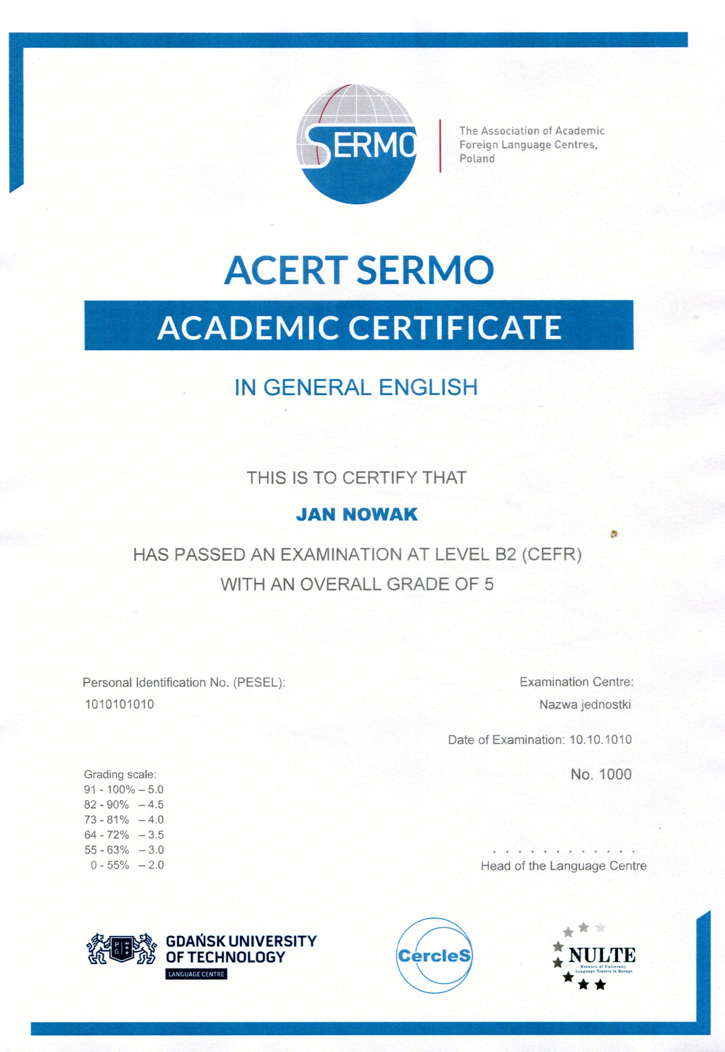 Nawigacja Egzaminy Egzamin ACERT Egzaminy zewnętrzne Wzory certyfikatu ACERT: Wzór certyfikatu w języku polskim. Wzór certyfikatu w języku angielskim.